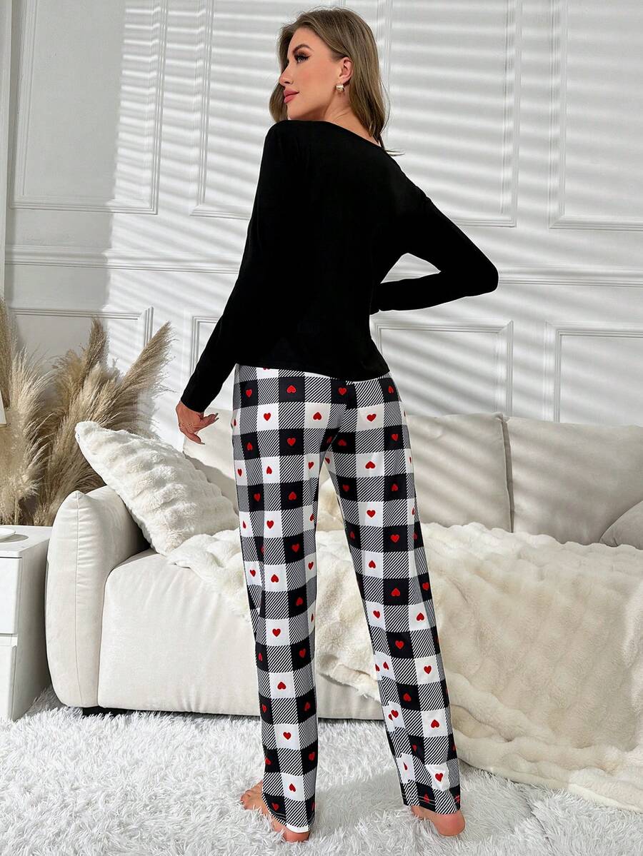 Heart & Letter Graphic Tee & Plaid Print Pants PJ Set