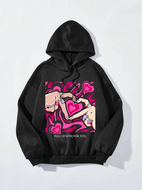 SHEIN EZwear Women'S Casual Gesture Heart & Letter Pattern Long Sleeve Hoodie, Autumn And Winter