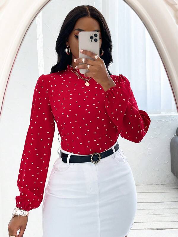 SHEIN Lady Heart Print Frill Trim Lantern Sleeve Blouse