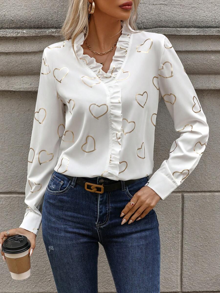 SHEIN Frenchy Heart Print Ruffle Trim Blouse