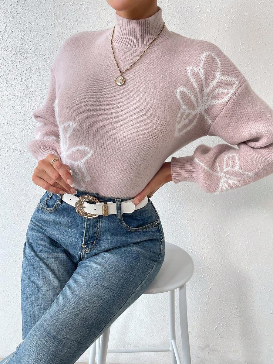 SHEIN Essnce High Neck Drop Shoulder Flower Pattern Sweater