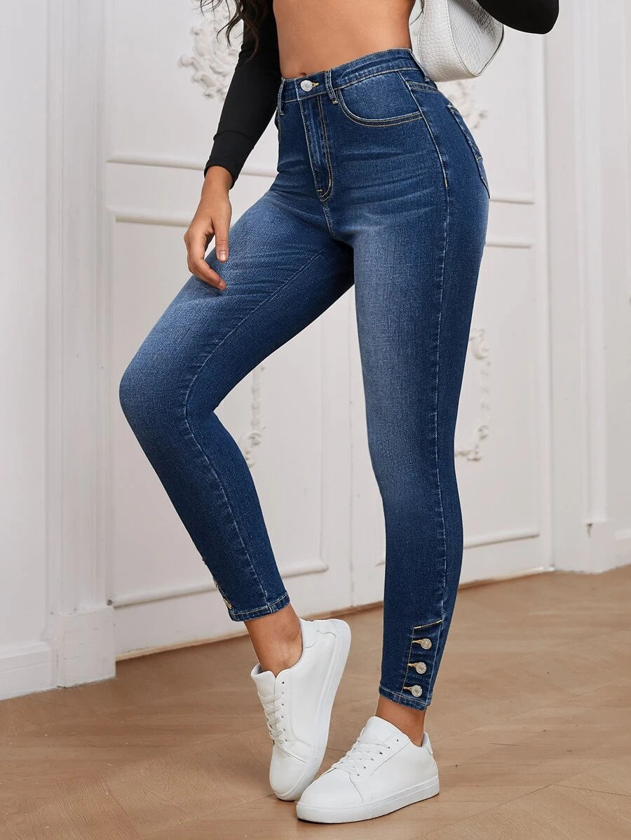 SHEIN Essnce High Waist Button Hem Skinny Jeans