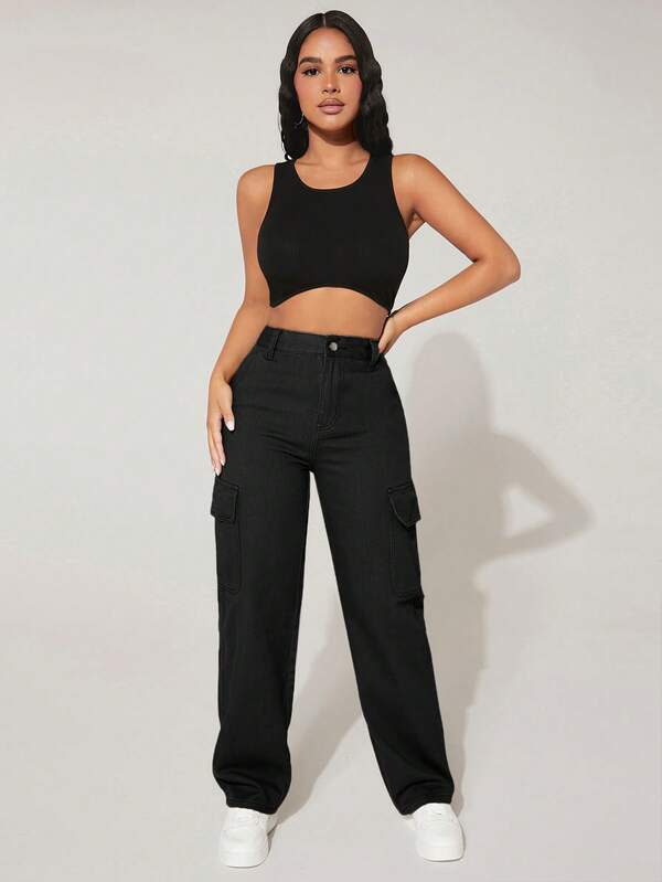 SHEIN PETITE High Waist Flap Pocket Cargo Jeans