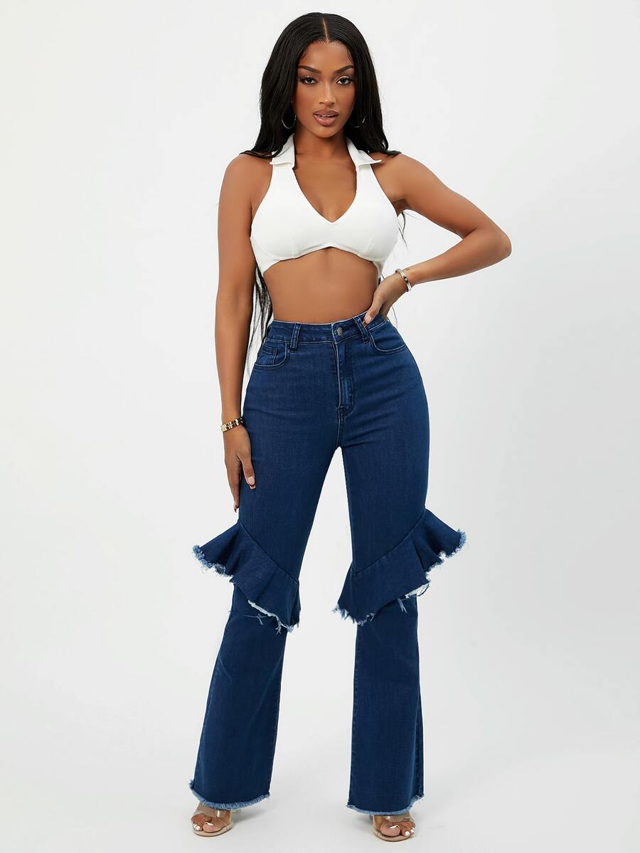 High Waist Raw Hem Frayed Ruffle Trim Flare Leg Jeans