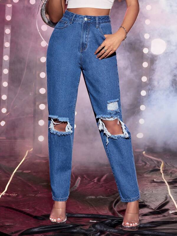 High Waist Ripped Mom Fit Jeans
