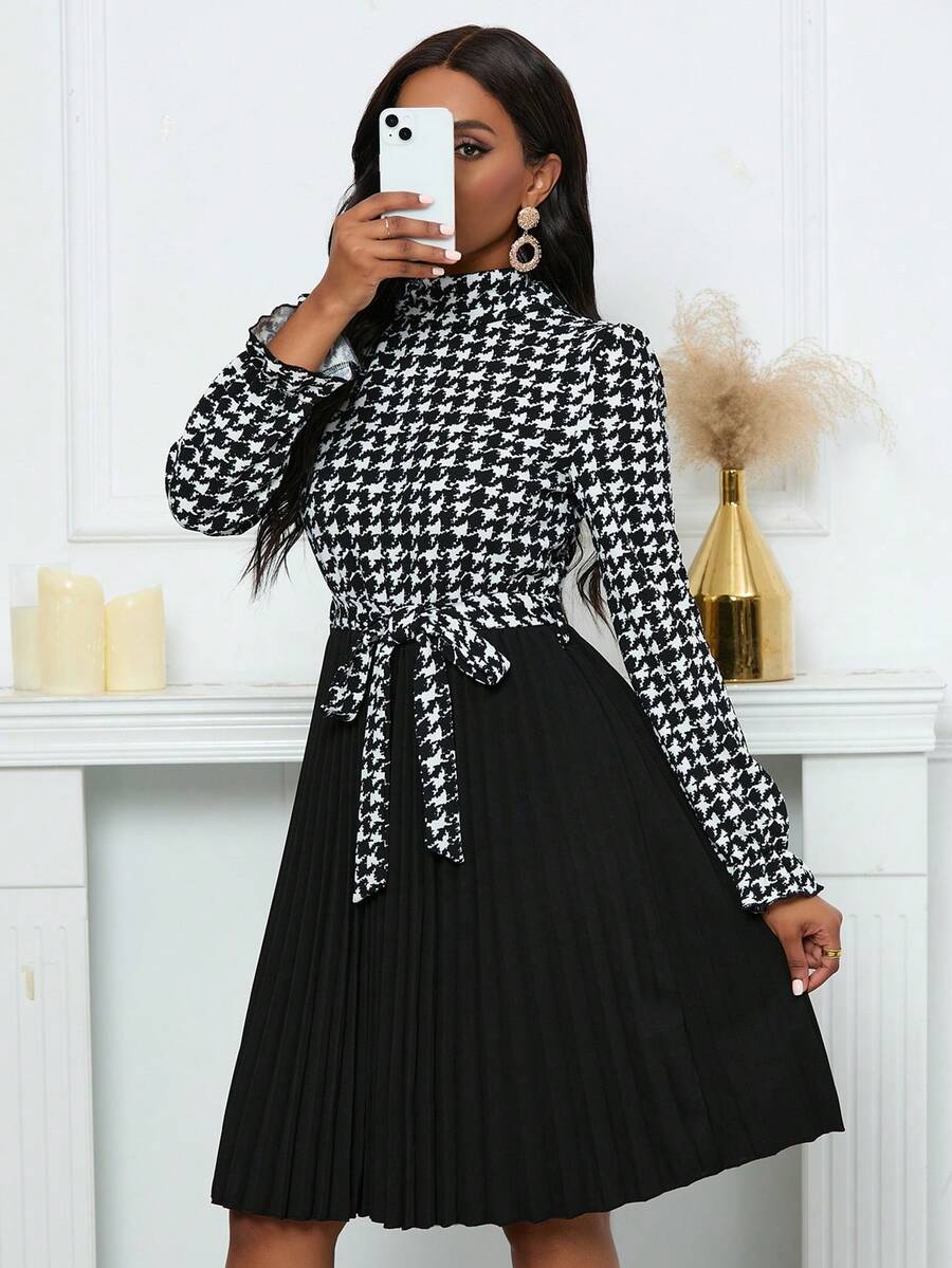 SHEIN Privé Houndstooth Pattern Belted Dress