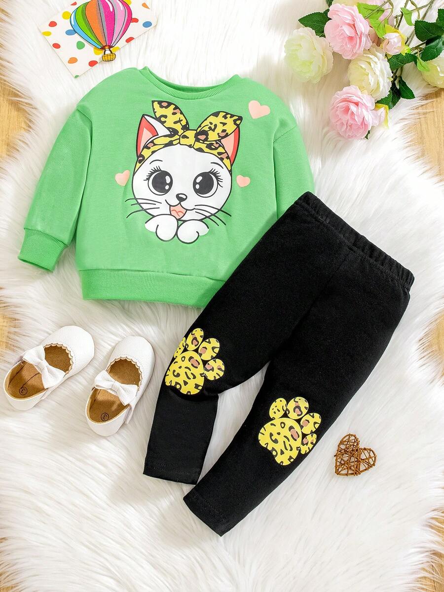 Infant Girls' Cartoon Cat Print Long Sleeve Sweatshirt And Leggings Set