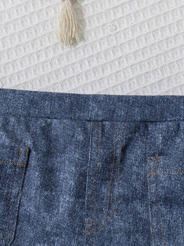 SHEIN Infant Girls' Casual Knitted Net Yarn Bubble Short Sleeve Top And Denim Style Half Skirt Set