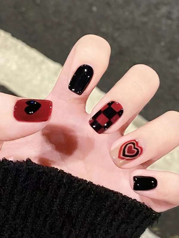 Instantly Upgrade Your Look with 24pcs Long Square Black Red Plaid Heart Pattern Fake Nail & 1pc Nail File & 1sheet Tape