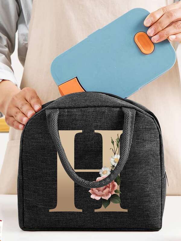 Insulated Thermal Lunch Dinner Bags Canvas Handbag Picnic Travel Cooler Box For School Child Food Lunch Bag Tote Initial Name A To Z Gold Letter Print
