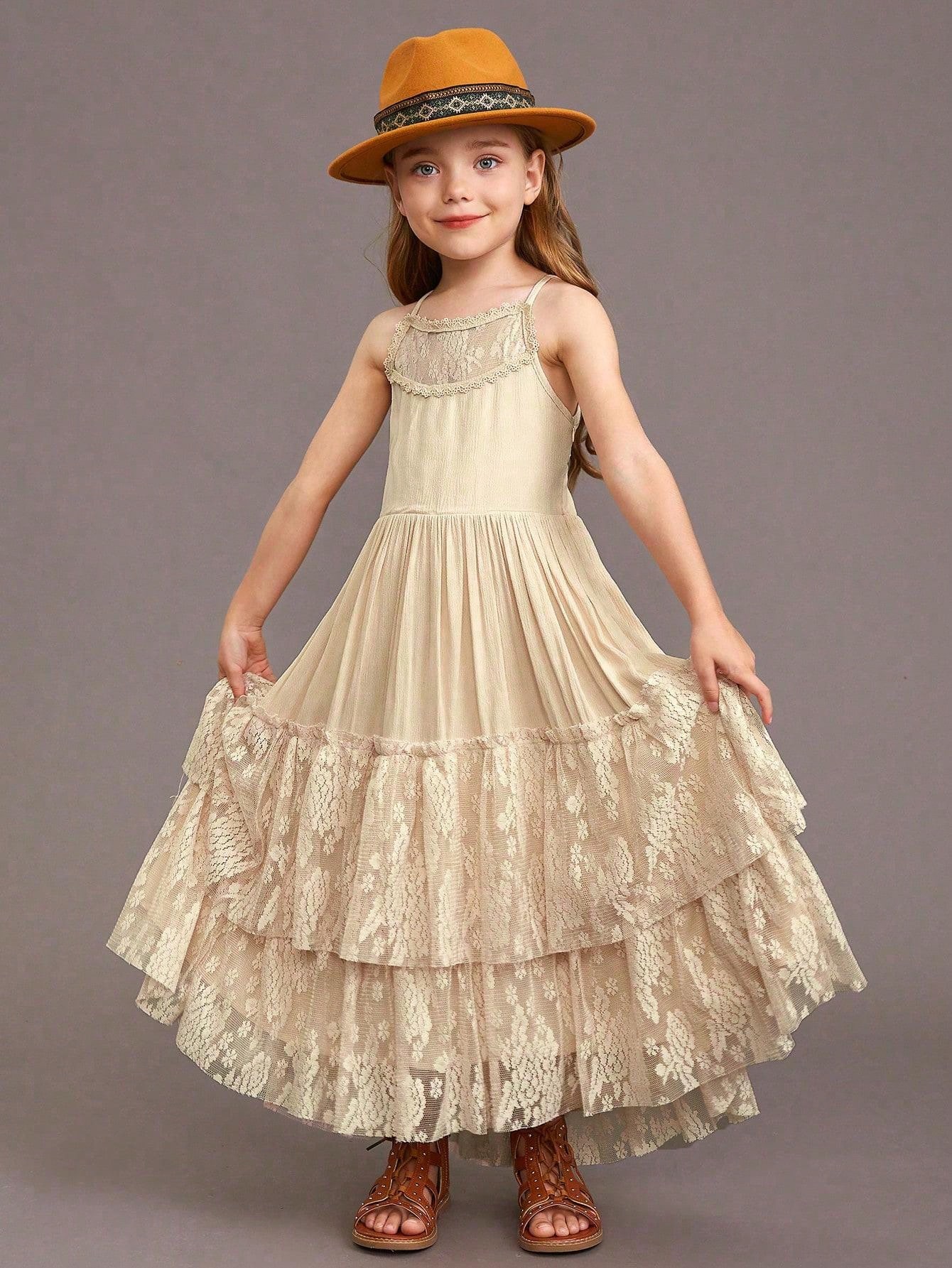 Junior Girls' Christmas Halter Lace Dress With Hollow Out Detail And Large Swing Skirt