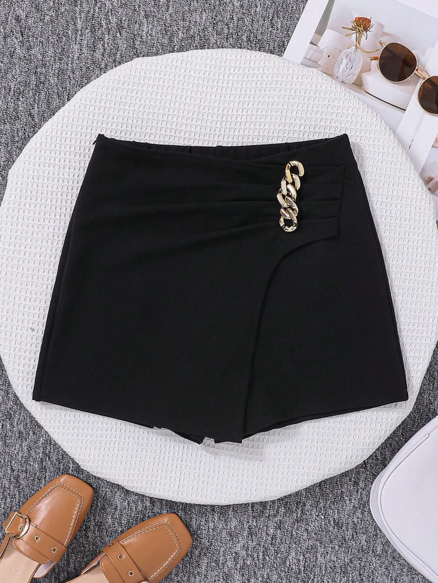 SHEIN Junvenile Girls' Solid Color Skort With Metallic Chain Decoration