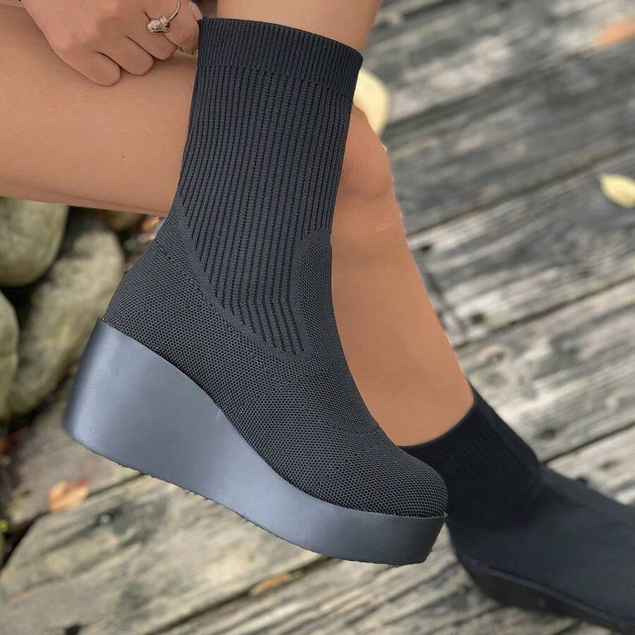 Knitted Short Boots Round Toe Wedge/ Mid Heel/ Mid Calf Boots Slim Fit Elastic Boots