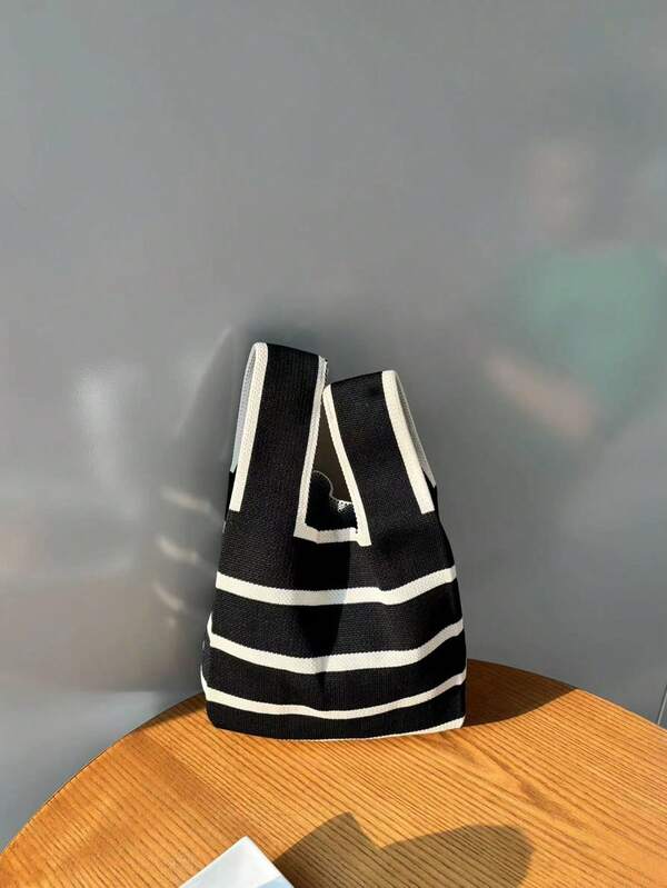 Knitted Vest Bag, Cute, Trendy, Simple, Handheld & Shoulder, Cat Printed, Color Block, Lightweight Luxury Style Women'S Bag