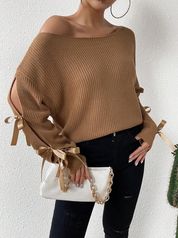 SHEIN Essnce Knotted Split Long Sleeve Solid Color Pullover Sweater