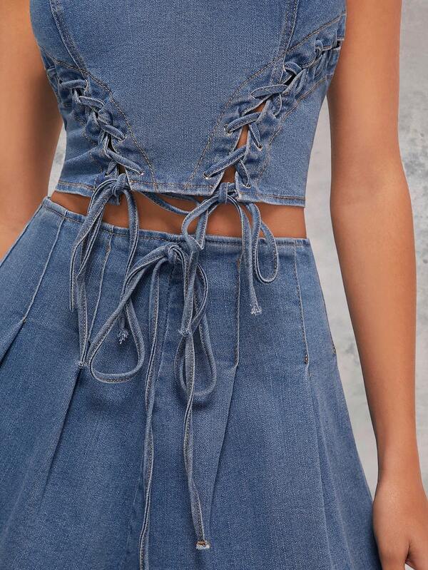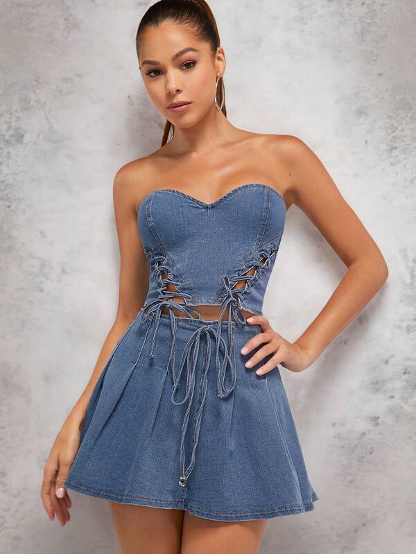 ALT Lace Up Denim Tube Top & Skirt Set