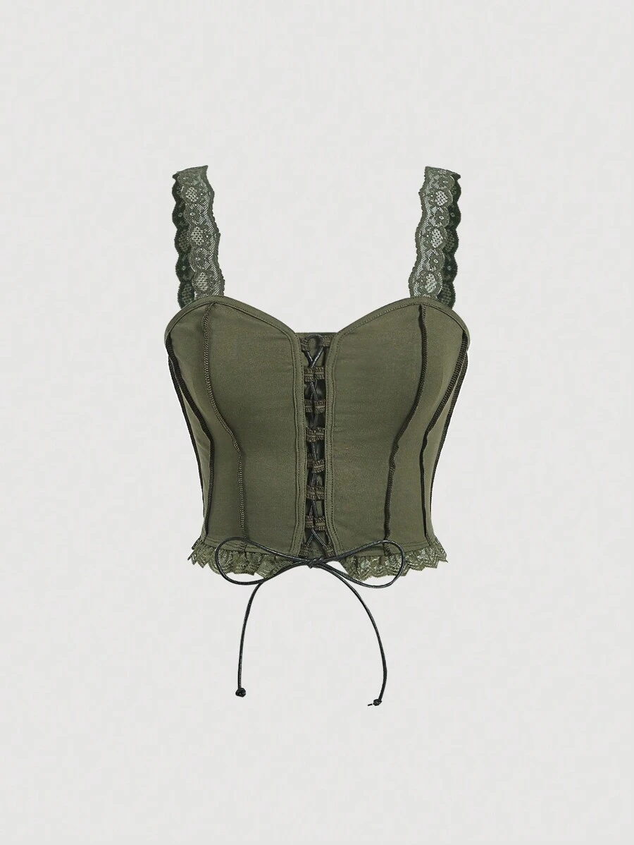SHEIN MOD Lace Up Front Contrast Lace Cami Top