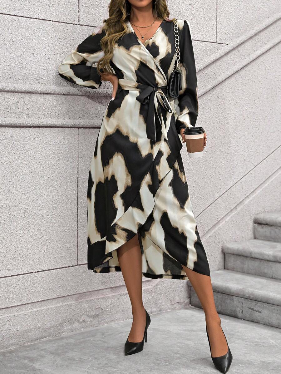 SHEIN Privé Ladies' Asymmetrical Hem Tie Waist Dress With Tie Dye And Ruffle Hem