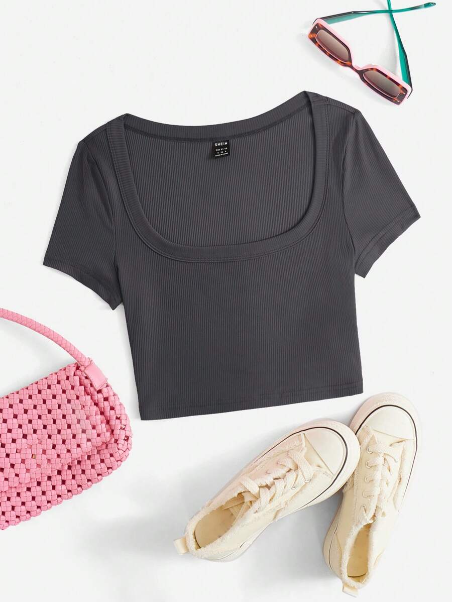 SHEIN Qutie Ladies' Cropped Ribbed Knit T-Shirt