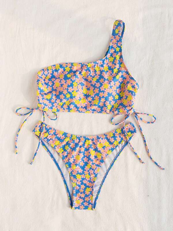 SHEIN SHEIN Swim Mod Ladies' Flower Print One Shoulder Two Piece Bikini Set
