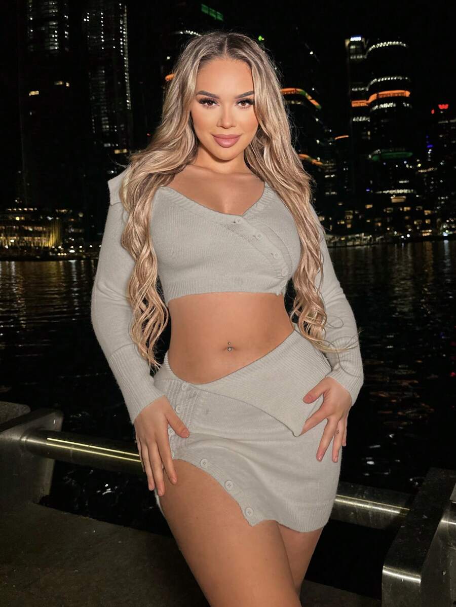 SHEIN SXY Ladies' Multiple Buttons Asymmetrical Collar Top And Skirt Set