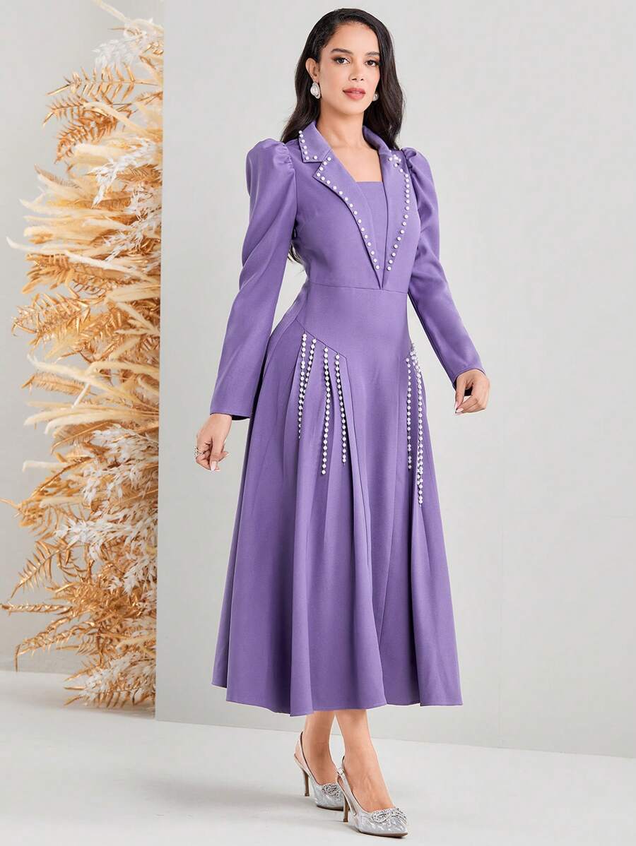 SHEIN Modely Ladies' Pearl-Studded Puff Sleeve Waist-Cinching Dress