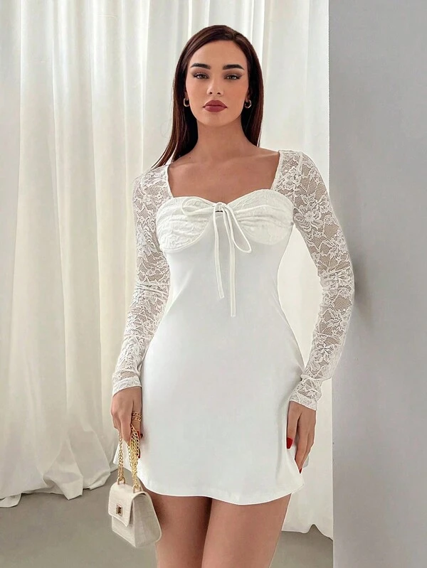 SHEIN Privé Ladies' Solid Color Lace Joint Sweetheart Neckline Self-Tie Dress