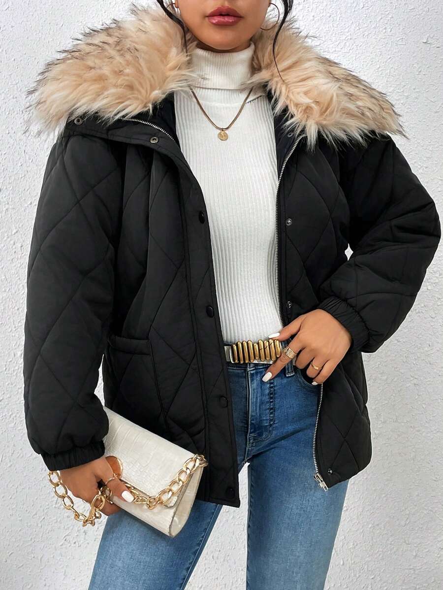 SHEIN LUNE Ladies' Solid Color Padded Coat With Pockets, Button And Fur Collar Decoration