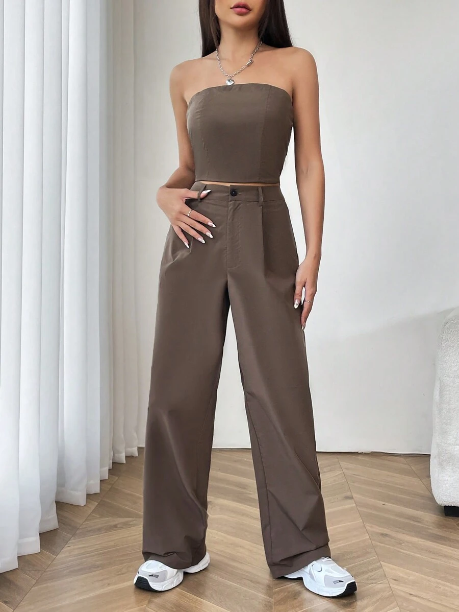 SHEIN EZwear Ladies' Solid Color Strapless Top And Straight Leg Pants 2pcs Set