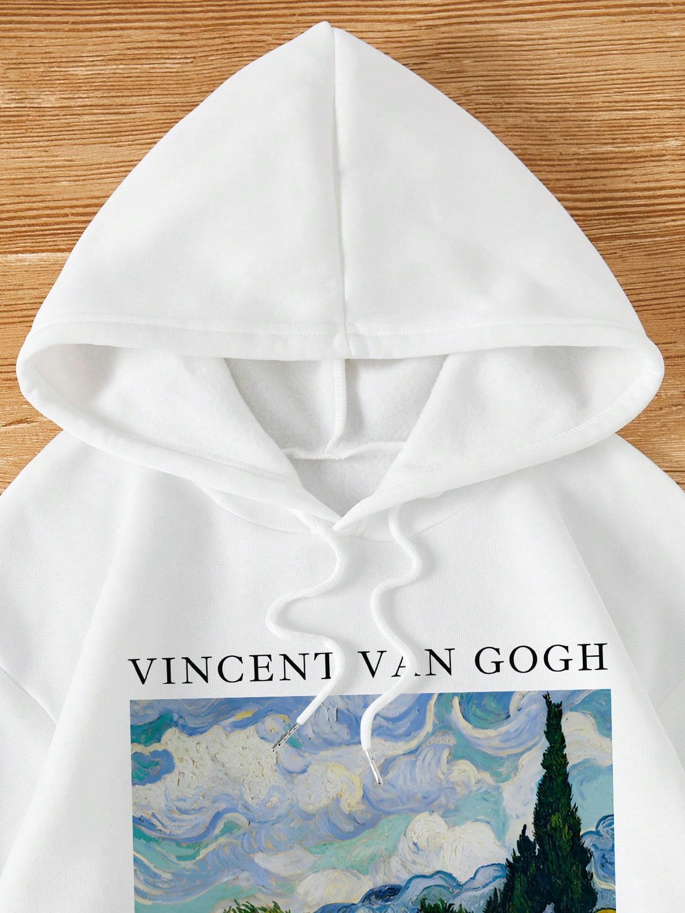 Landscape & Letter Graphic Kangaroo Pocket Drawstring Thermal Lined Hoodie