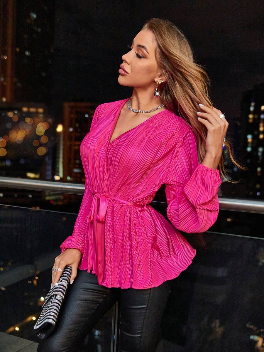 SHEIN Privé Lantern Sleeve Belted Plisse Blouse