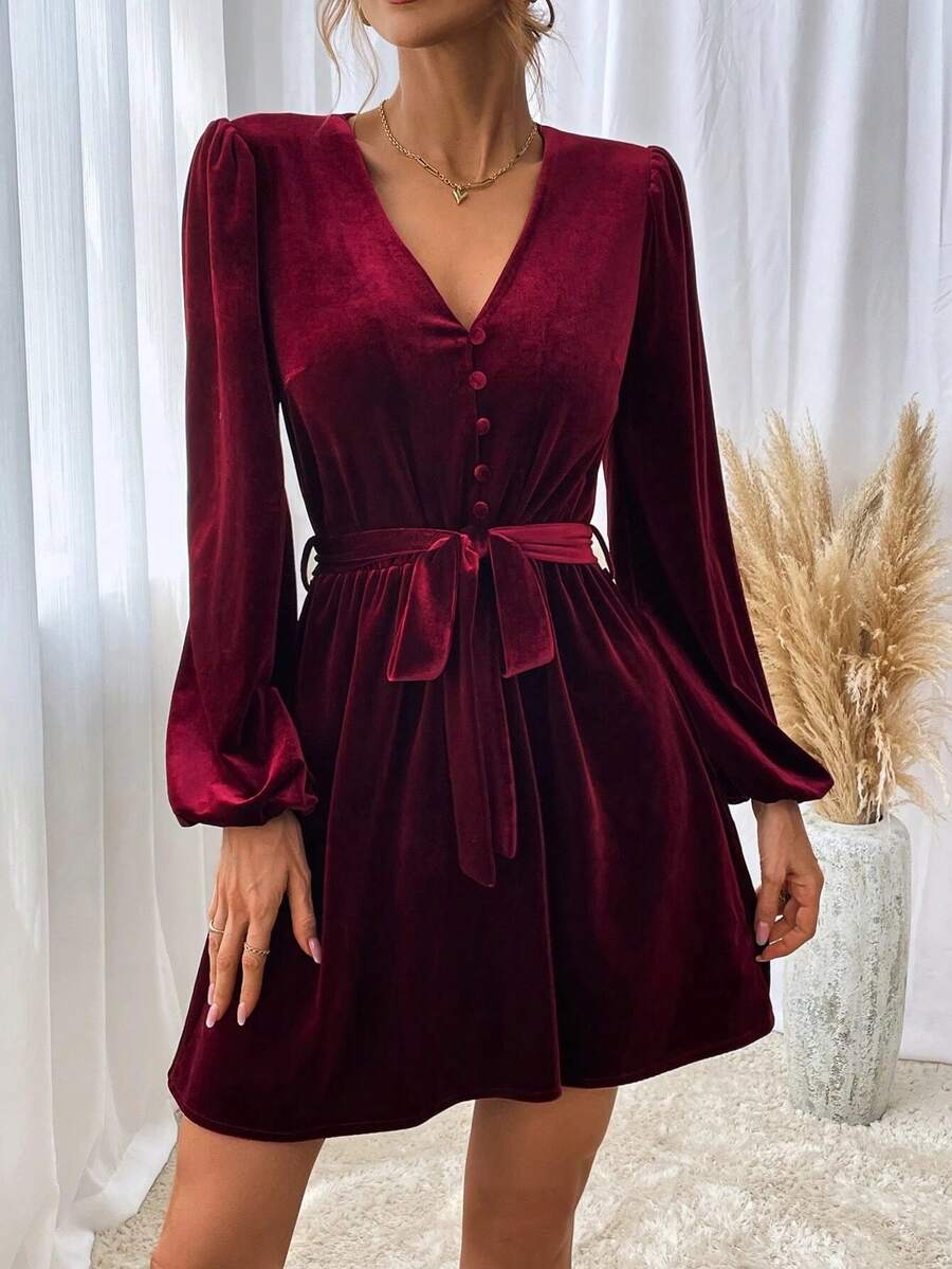 Lantern Sleeve Belted Velvet Dress