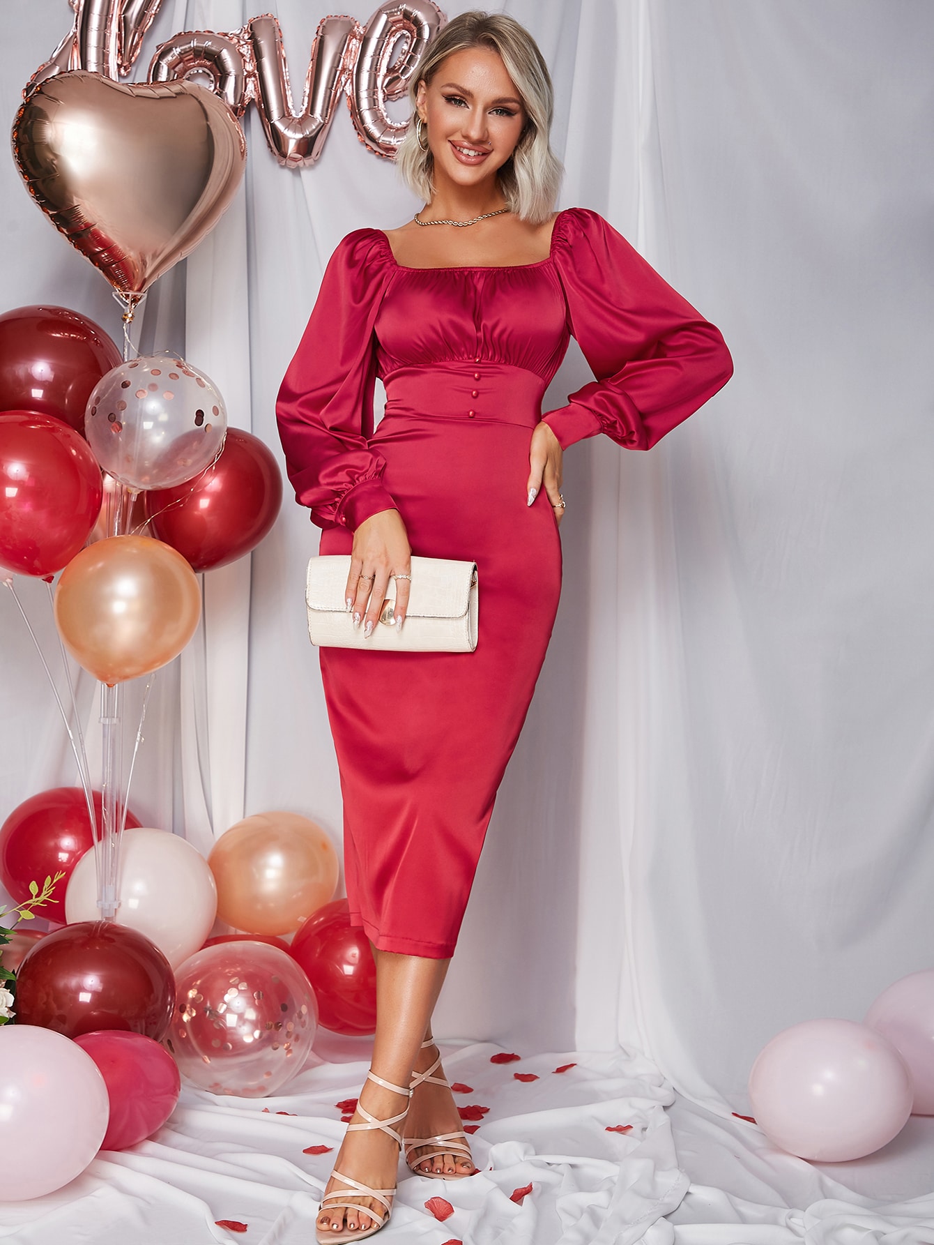 Eilly Bazar Lantern Sleeve Button Front Split Back Satin Dress
