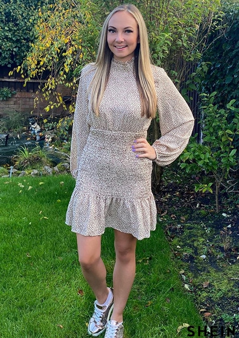 SHEIN Frenchy Lantern Sleeve Shirred Ruffle Hem Allover Print Dress