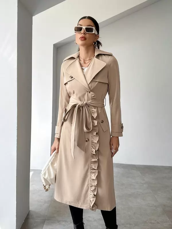 SHEIN Privé Lapel Neck Ruffle Trim Belted Trench Coat
