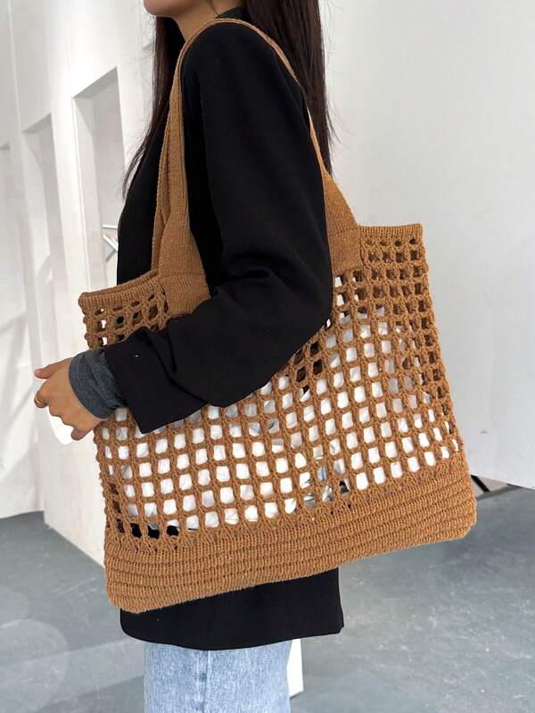Large Capacity Casual Hollow Design Shopping Bag Crochet Bag, Suitable For Teenage Girls, Female College Students, Rookies And White-Collar Workers, Perfect For Office, University, Work, Business, Commuting, Outdoor, Travel, Outing