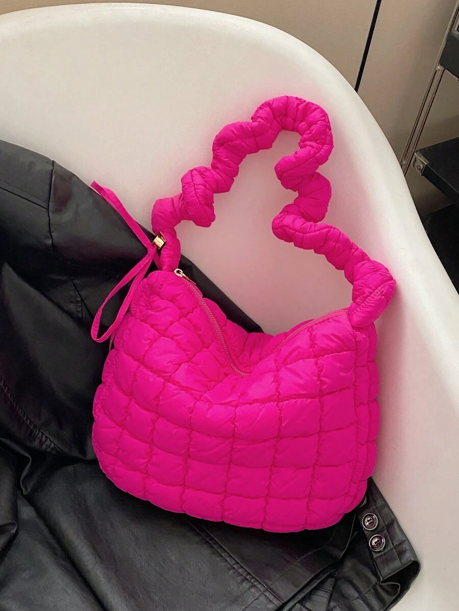 Large Capacity Elastic Check Grid Stitching Adjustable Crossbody Bag, Foldable, Fashion Tote Shoulder Bag For Women Warm Puffy Monochrome Winter Coats Bag