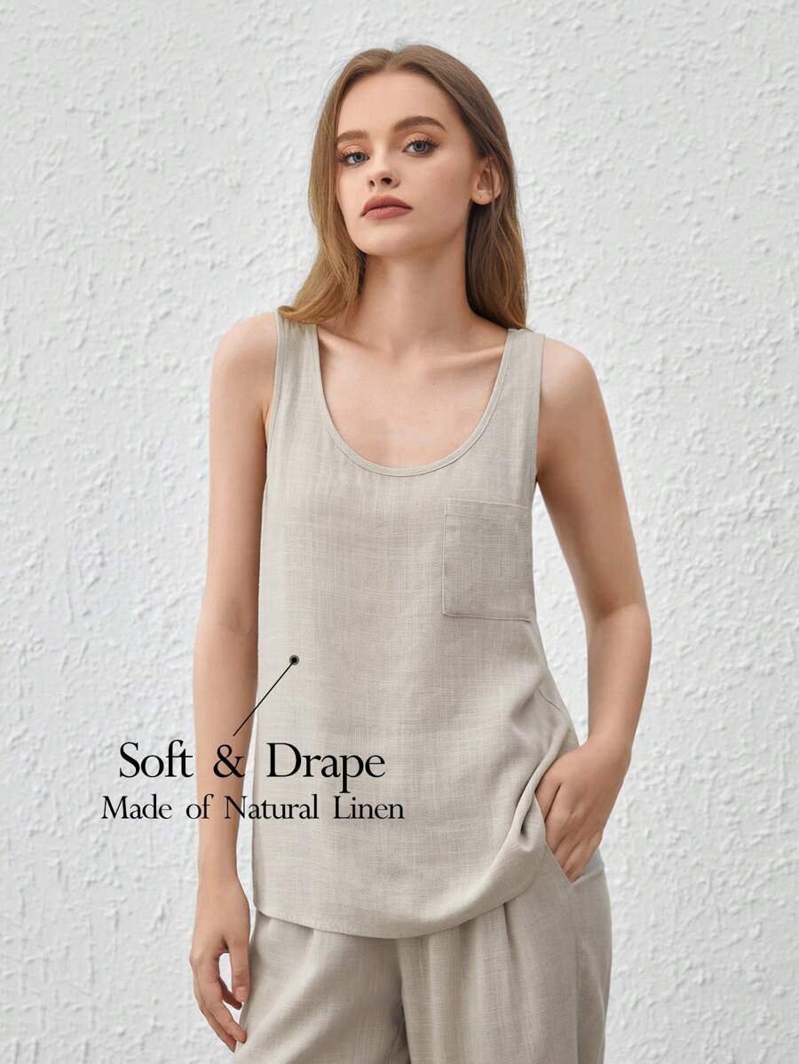 Leisure Natural Linen Comfy & Breathable Khaki Front Pocket Tank Top