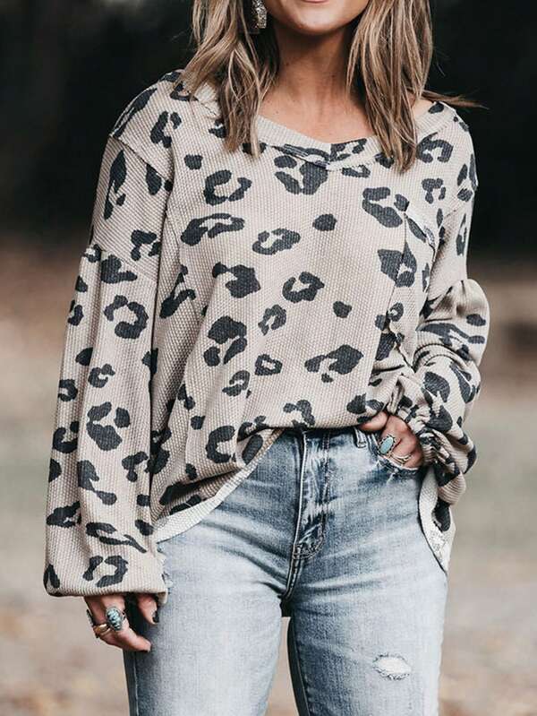 Leopard Balloon Sleeve Waffle Knit Plus Size Top