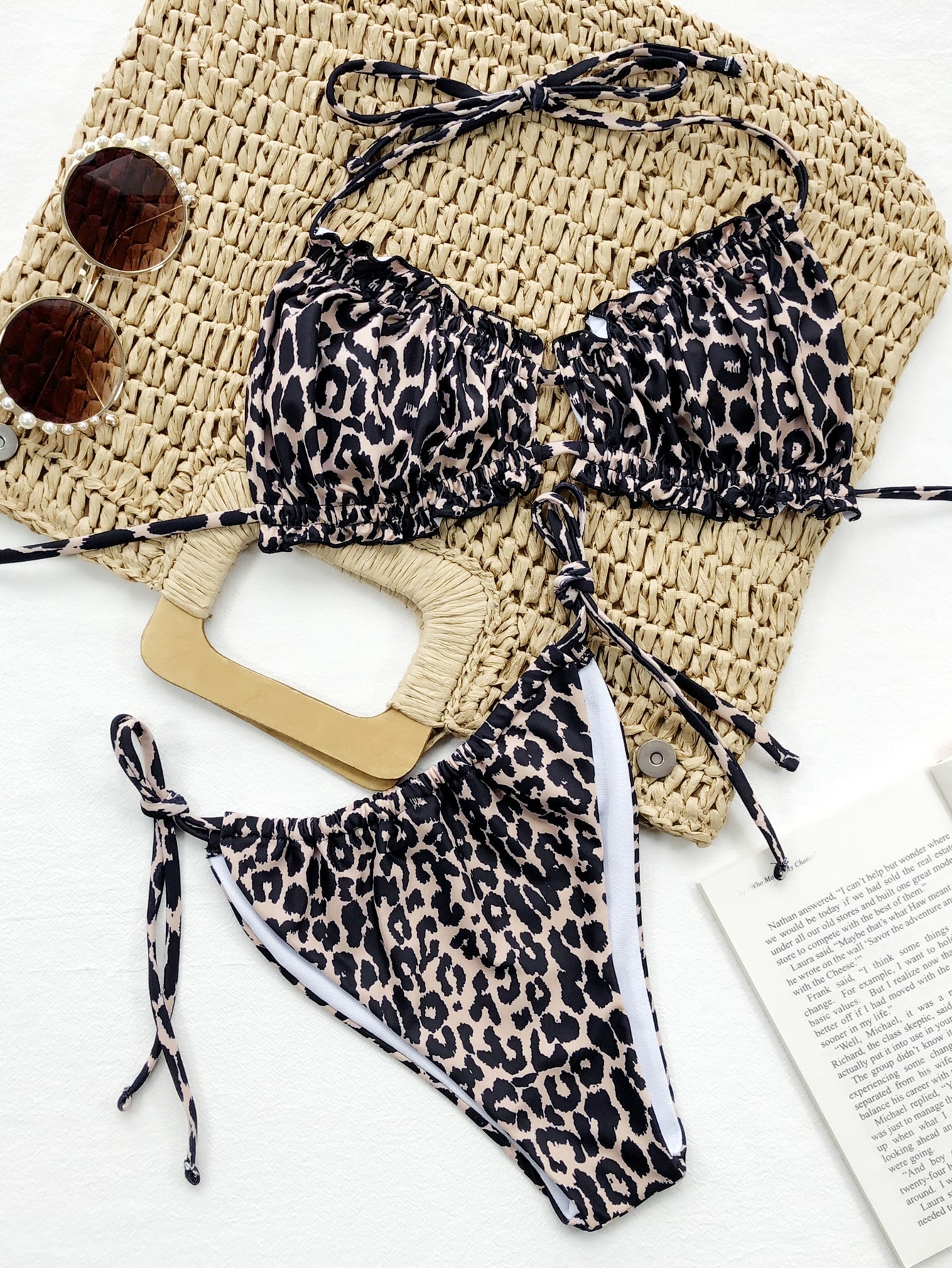 SHEIN Swim Vcay Leopard Bikini Set Ruched Frill Trim Halter Bra & Thong Bottom 2 Piece Bathing Suit