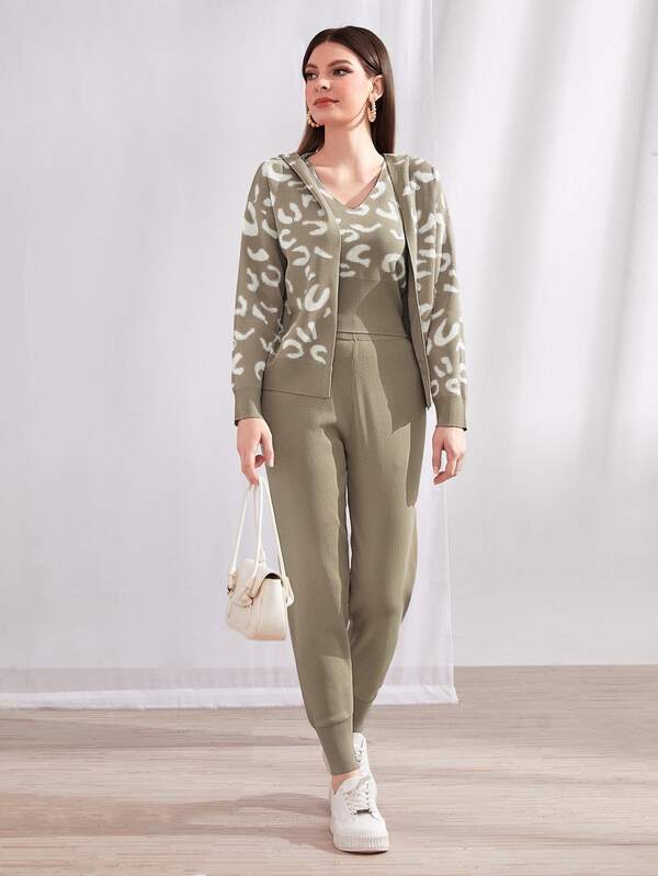 SHEIN Mulvari Leopard Pattern Cardigan & Sweater Vest & Knit Pants