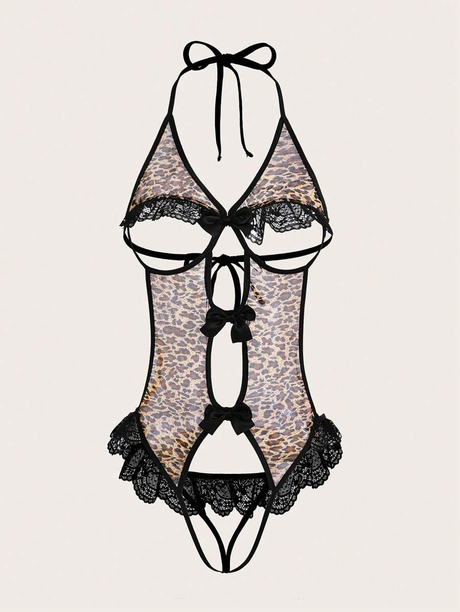 Leopard Print Cut Out Halter Teddy Bodysuit