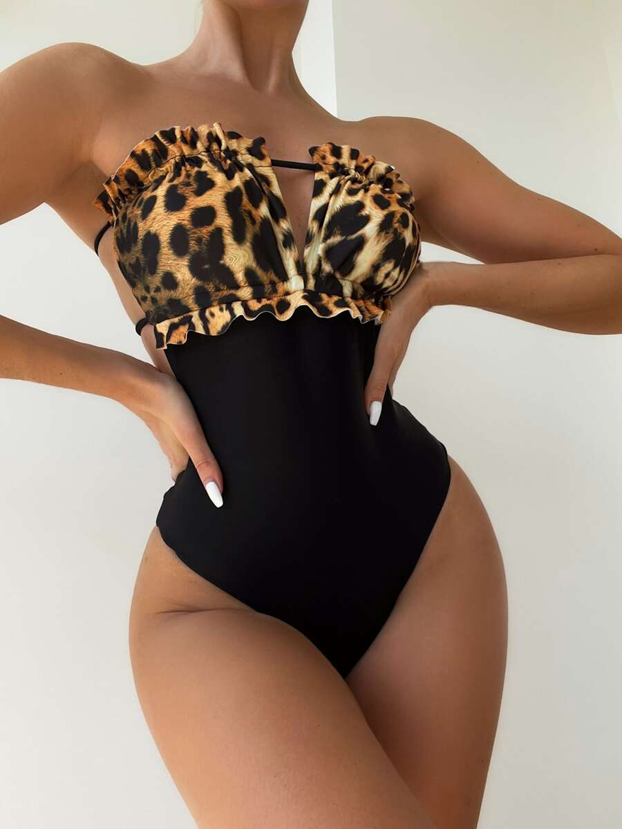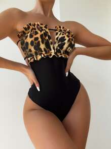 SHEIN Swim Chicsea Leopard Print Frilled Tie Back Tube One Piece Swimsuit
