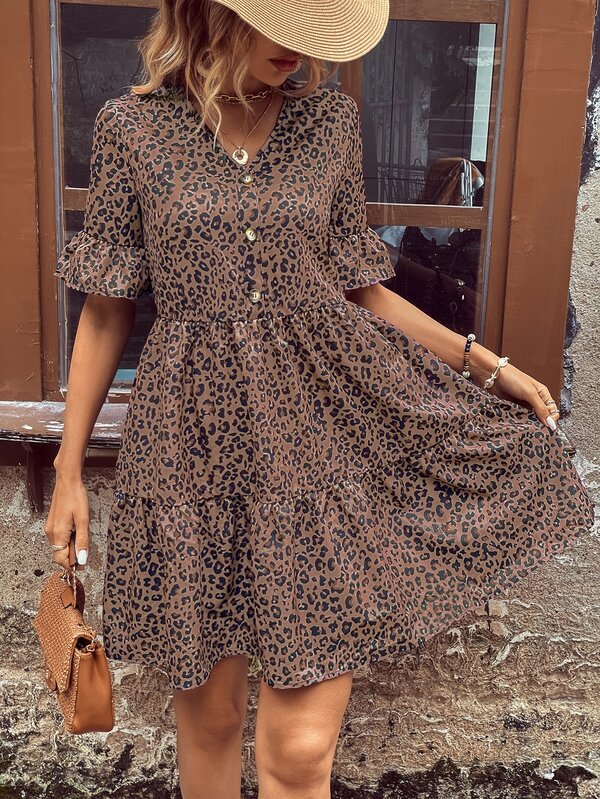 SHEIN VCAY Leopard Print Half Button Ruffle Hem Smock Dress