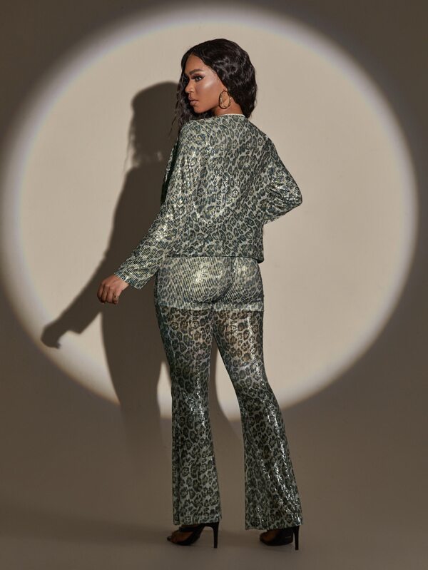SHEIN Unity Leopard Print Open Front Sequin Top & Flare Leg Pants Without Camisole