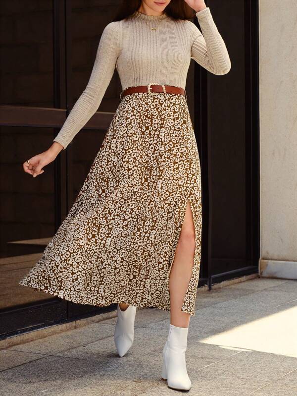 SHEIN Frenchy Leopard Print Split Thigh Dress Without Belt