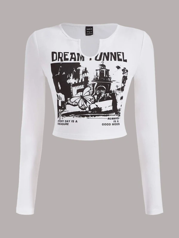 SHEIN Coolane Letter & Building Print Notched Neck Crop Tee