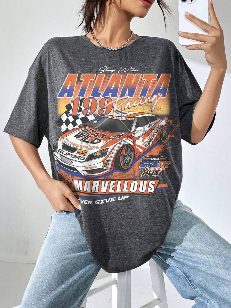 SHEIN EZwear Letter & Car Pattern Print Round Neck T-Shirt