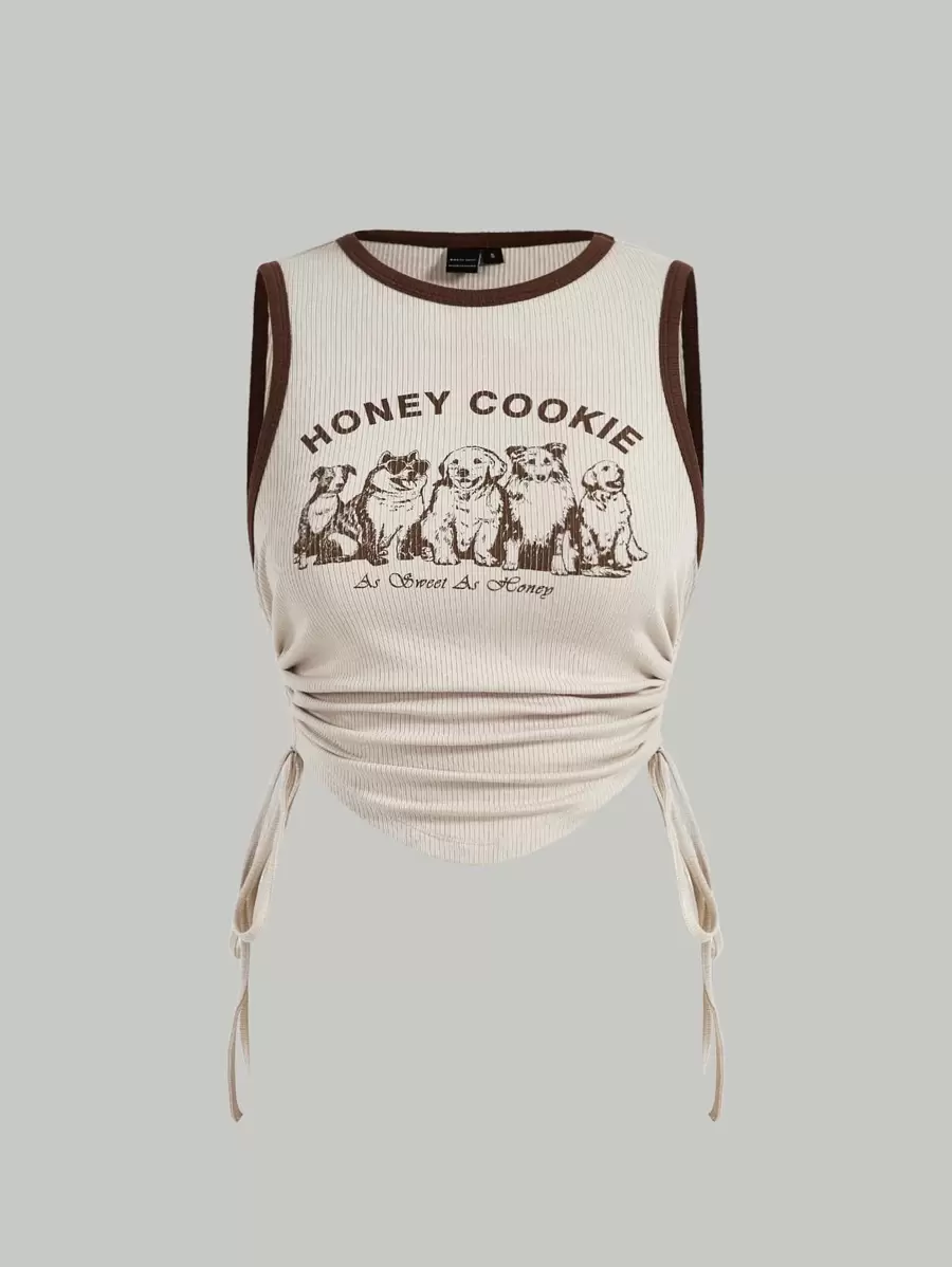 SHEIN MOD Letter & Dog Print Drawstring Side Contrast Binding Crop Tank Top