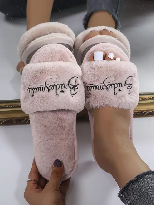 Letter Embroidered Fluffy Slippers, Pink Embroidered Letter Women's House Slippers
